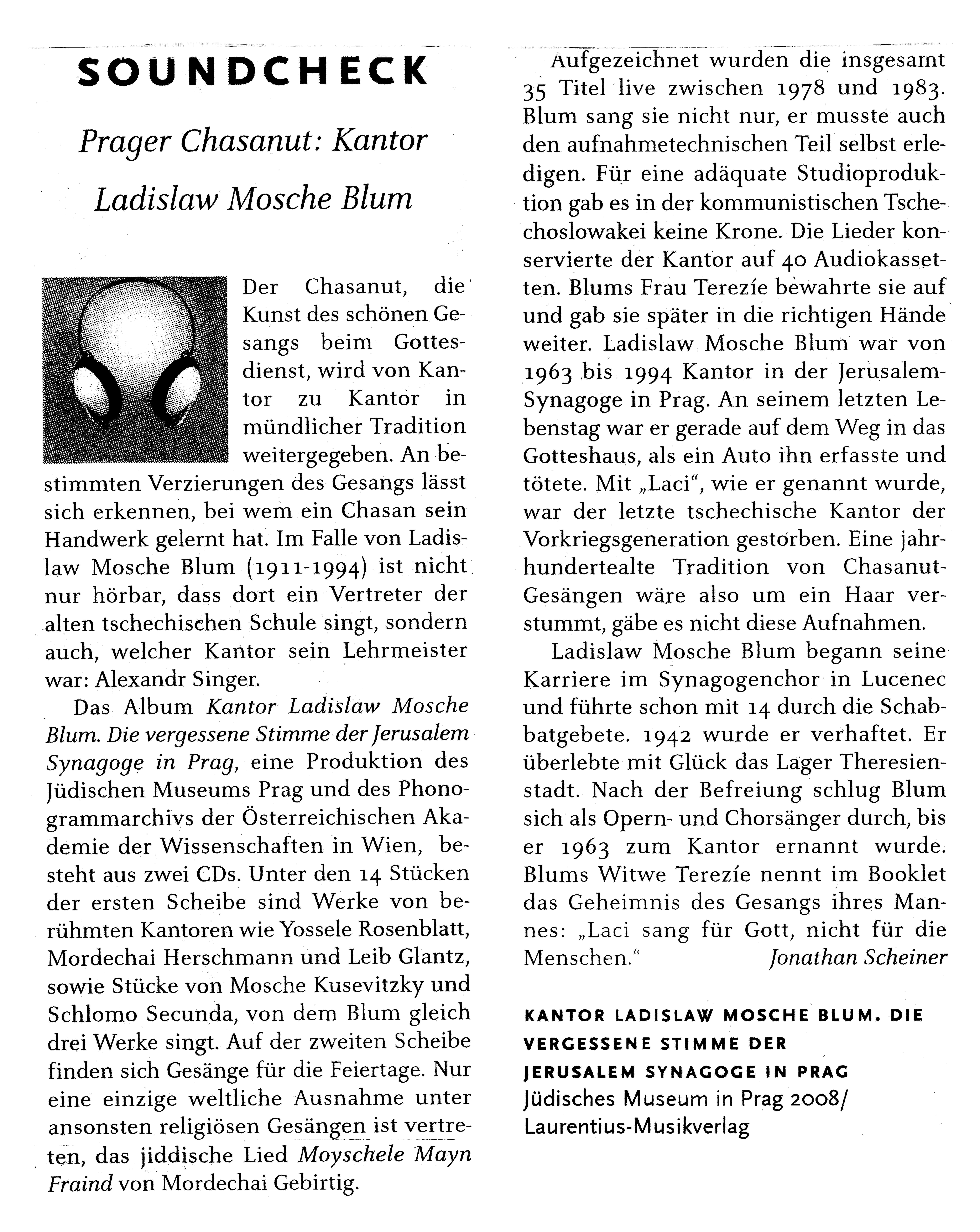 Mit der Doppel-CD The Forgotten Voice of the Jeruzalémská Synagogue in Prague präsentiert das Jüdische Museum Prag mit Unterstützung des Phonogrammarchivs der Österreichischen Akademie der Wissenschaften einen einmaligen Schatz. Es handelt sich dabei um eine Auswahl von Privataufnahmen, die der berühmte Kantor Ladislav Moshe Blum auf 40 Cassetten zwischen 1978 und 1983 in der Jerusalem-Synagoge in Prag aufgenommen hat. Blum (1911–1994) war der letzte Kantor (Vorbeter oder auf hebräisch Chasan) der Vorkriegs-Generation; er wirkte von 1963–1994 als Kantor an der Jerusalem-Synagoge. Blum fertigte diese Amateur-Aufnahmen an, um diese bedeutende lokale Kulturtradition für folgende Generationen zu bewahren. Die Aufnahmen umfassen Gesänge für den Gottesdienst am Sabbat und an hohen Feiertagen, für Gedenkveranstaltungen für die Todesopfer von Theresienstadt (Terezín) und sogar Aufführungen des Chors der Jüdischen Gemeinde in Prag, der von Blum geleitet wurde. Die Aufnahmen wurden von der tschechischen Musikwissenschaftlerin Veronika Seidlová ausgewählt, die auch für das ausführliche und höchst informative Booklet verantwortlich zeichnet. Eine kleine Hörprobe finden Sie hier.