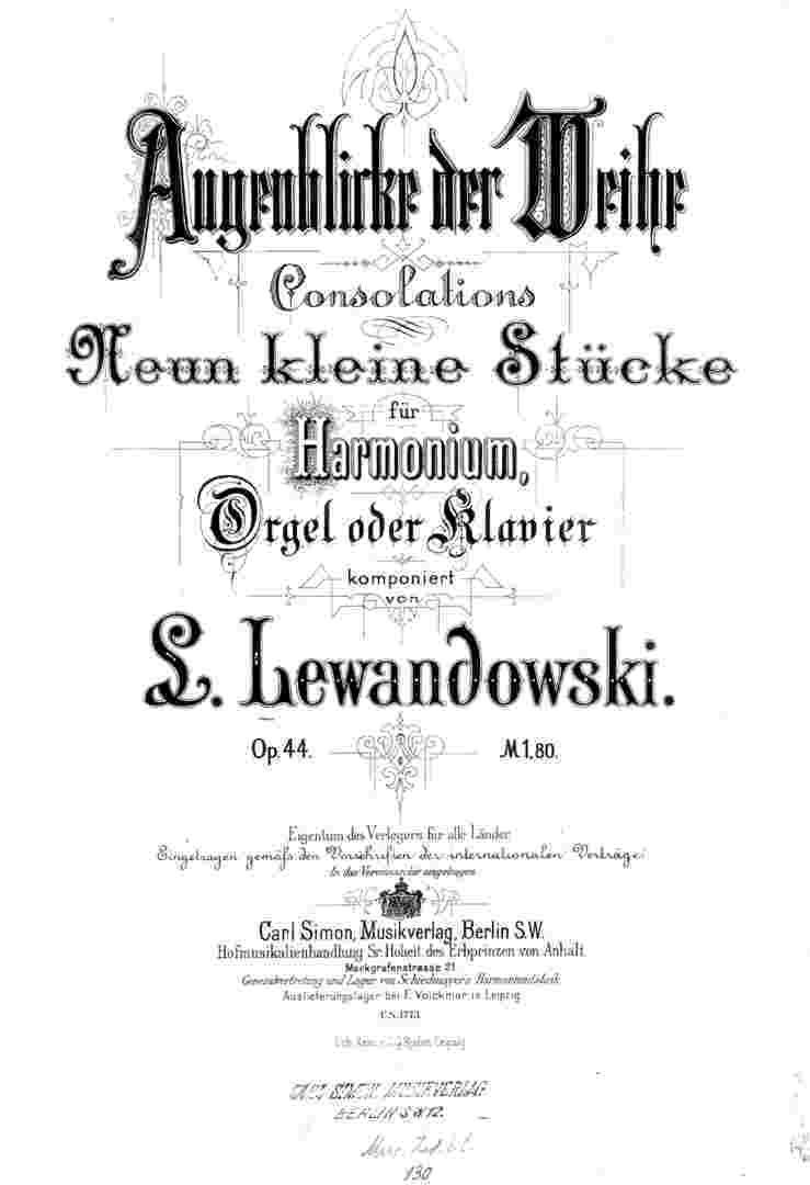 Lewandowskis „Augenblicke der Weihe. Consolations. Neun kleine Stücke für Harmonium (Orgel oder Klavier)“ erschienen als Opus 44 erstmals ca. 1880 im Musikverlag Carl Simon in Berlin. Die Besetzungsangabe trägt der Tatsache Rechnung, dass viele jüdische Gemeinde nicht über eine Orgel verfügten, sondern lediglich ein Harmonium für den Gottesdienst einsetzen konnten.