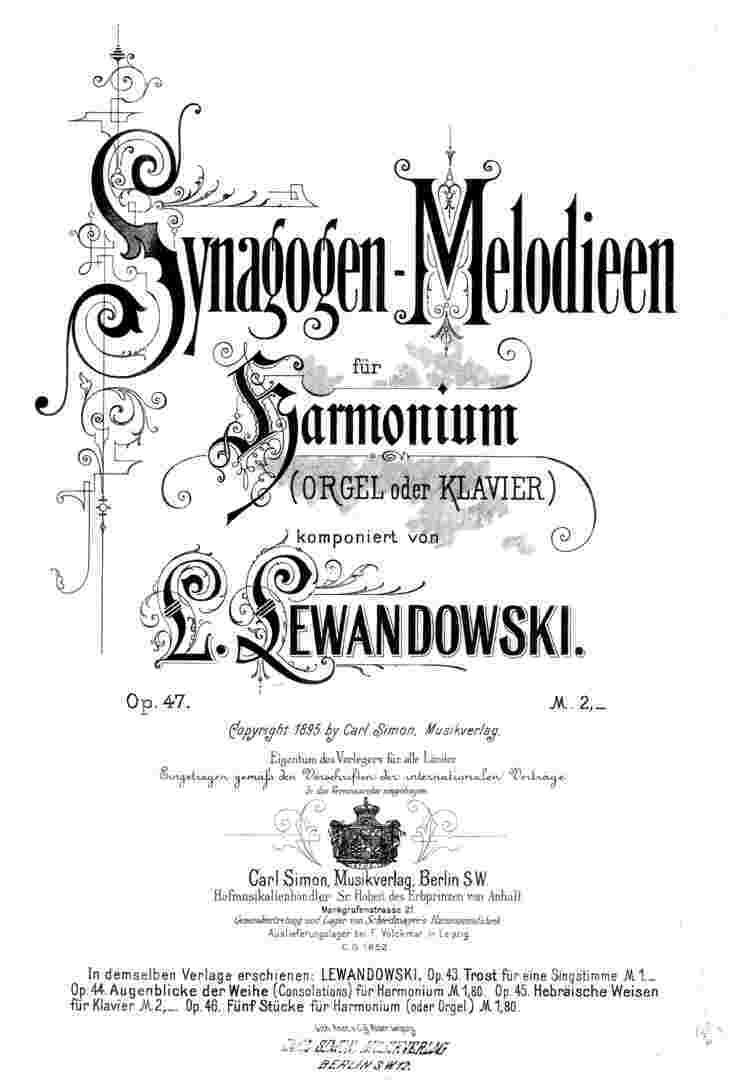 Lewandowskis Synagogen-Melodien für Harmonium (Orgel oder Klavier) erschienen als Opus 47 erstmals 1895 im Musikverlag Carl Simon in Berlin. Die Besetzungsangabe trägt der Tatsache Rechnung, dass viele jüdische Gemeinde nicht über eine Orgel verfügten, sondern lediglich ein Harmonium für den Gottesdienst einsetzen konnten.